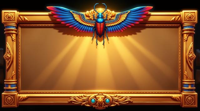 Золотая декоративная рамка для слот-барабанов в мультяшном стиле. Рамка должна выглядеть роскошной, с резными орнаментами и блестящими золотыми деталями, вдохновлёнными древнеегипетским искусством. В верхней части композиции расположен скарабей с расправленными разноцветными крыльями — синий, красный и изумрудный оттенки. Слева и справа можно добавить небольшие узоры или вставки в стиле египетских символов. Рамка должна быть яркой, богатой и гармонично сочетаться с игровым фоном, оставляя в центре достаточно места для барабанов