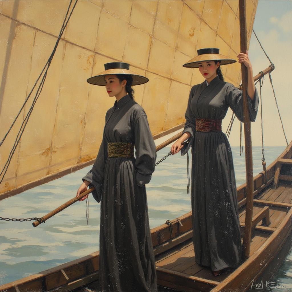 КАРТИНА В СТИЛЕ Jack Vettriano ТЕХНИКОЙ ШИРОКИМИ МАЗКАМИ С ТЕКСТУРНЫМ НАСЛОЕНИЕМ модерн, в стиле КАРТИН Jeremy Mann. ДВЕ КИТАЙСКИЕ ЖЕНЩИНЫ В ПРИБЛИЖЕННОЙ ПОЗИЦИИ АРИСТОКРАТИЧНОГО ВИДА ОДЕТЫЕ В НАЦИОНАЛЬНУЮ КРЕСТЬЯНСКУЮ ОДЕЖДУ В ГОЛОВНЫХ УБОРАХ ЛИМАО ПЛЫВУТ НА КИТАЙСКОЙ ДЖОНКЕ ОДНА СТОИТ С ШЕСТОМ ВТОРАЯ СИДИТ ПО РЕКЕ С ПРИРОДОЙ И ДЕРЕВУШКОЙ НА БЕРЕГУ