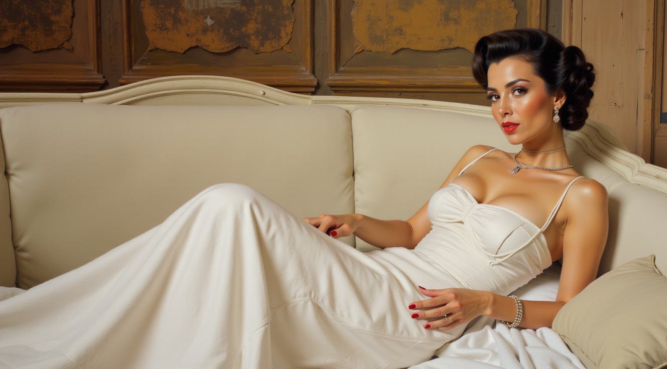 КАРТИНА В СТИЛЕ Jack Vettriano ТЕХНИКОЙ ШИРОКИМИ МАЗКАМИ С ТЕКСТУРНЫМ НАСЛОЕНИЕМ модерн, в стиле КАРТИН Jeremy Mann. НА БОЛЬШОМ ДИВАНЕ ,ПОКРЫТОМ БЕЛЫМ ПОКРЫВАЛОМ СИДИТ ЖЕНЩИНА БРЮНЕТКА АРИСТОКРАТИЧНОГО ВИДА 1950 ГОДОВ, ОДЕТАЯ В БЕЛОЕ ПЛАТЬЕ БЕЗ РУКАВОВ С СОБРАННЫМИ ВОЛОСАМИ С УКРАШЕНИЯМИ, КОТОРАЯ СМОТРИТ В БОЛЬШОЕ КРУГЛОЕ ЗЕРКАЛО , ВИСЯЩЕЕ НА СТЕНЕ