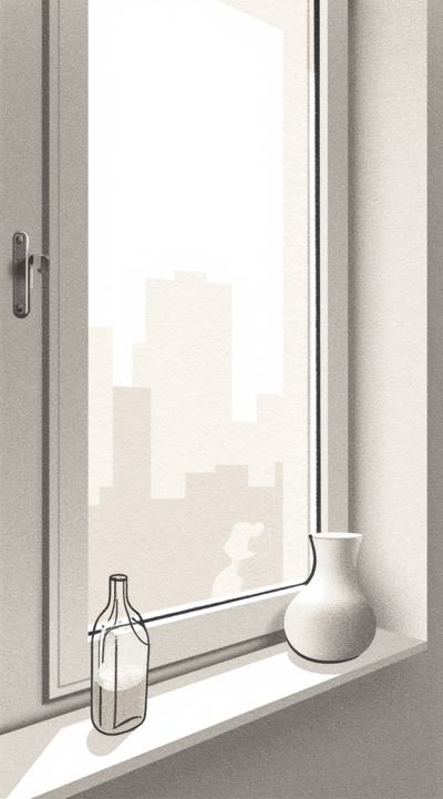 Вид изнутри комнаты., Композиция и ракурс:, Крупный план на подоконнике. Высокое окно занимает весь задний план, но оно сильно расфокусировано. Мы смотрим на него со стороны комнаты, и кадр построен так, что подоконник с предметами находится вплотную к "зрителю", занимая нижнюю половину изображения., , Окно — это световой фон. За ним виден лишь смутный, мягкий силуэт заснеженных крыш города и неба, без деталей., На широком деревянном подоконнике лежат:, , Две фарфоровые чашки, Раскрытая книга лежит рядом.