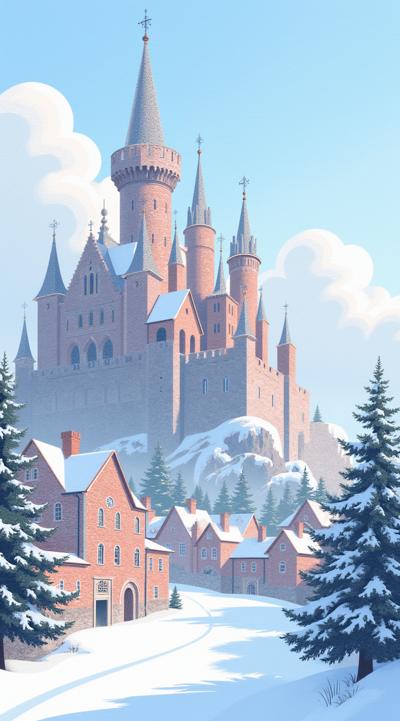 на изображении красивейшая, спокойная, умиротворяющая зима, средневековый дворец в средневековом городе. дворец поражает своей высотой и стройностью. он как будто воздушный, тончайшие башни и резьба, красивейшие арки, множество архитектурных деталей, вокруг дворца видно дома, которые ниже чем дворец, но этих домов много., в башенке дворца свет и видно два силуэта, атмосфера покоя и уюта