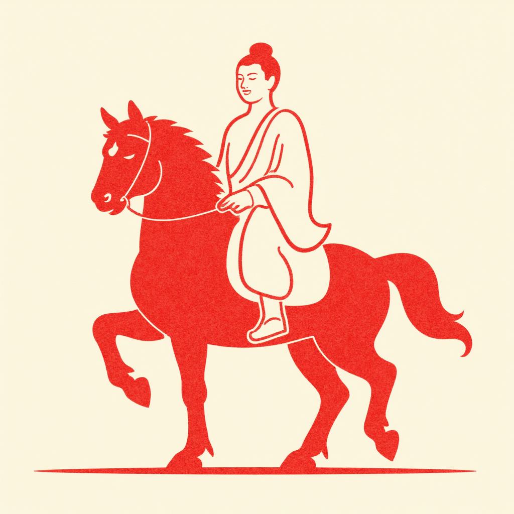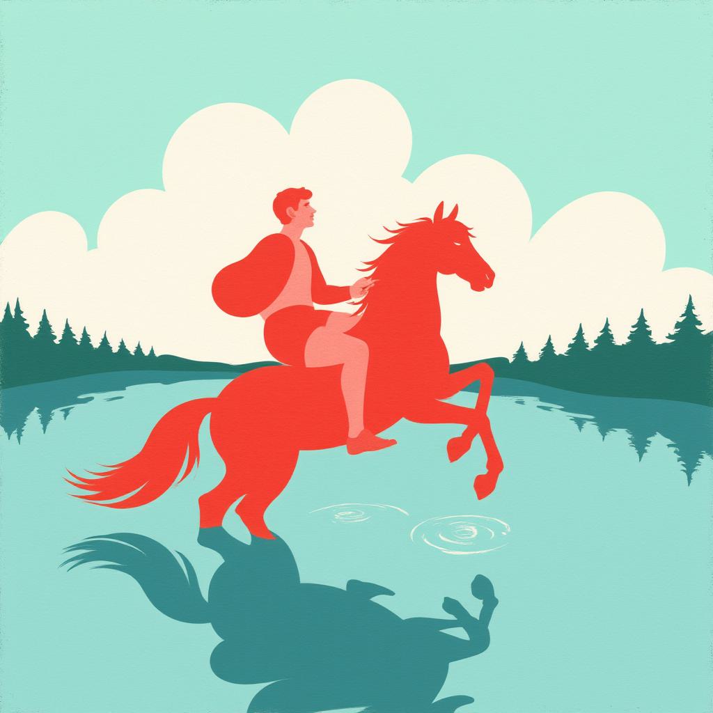 A symbolic painting in the spirit of Kuzma Petrov‑Vodkina: a majestic red horse in a lake, on which sits a rider in shorts. The horse reared. The color of the horse is bright scarlet, with blue-green shades of water, sky with clouds. Spherical perspective, flat image, clear silhouettes. Two more horses (white and reddish) are visible in the distance. heat. Style: modernism with elements of icon painting. Rich, pure colors, a minimum of semitones and high-quality graphics.