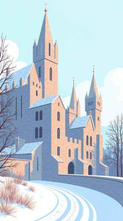 На изображении зима, на изображении красивейшая, спокойная, умиротворяющая зима, средневековый дворец в средневековом городе. дворец поражает своей высотой и стройностью. он как будто воздушный, тончайшие башни и резьба, красивейшие арки, множество архитектурных деталей, , вокруг дворца видно немного город, дома ниже чем дворец., в башенке дворца свет и видно два силуэта, атмосфера покоя и уюта