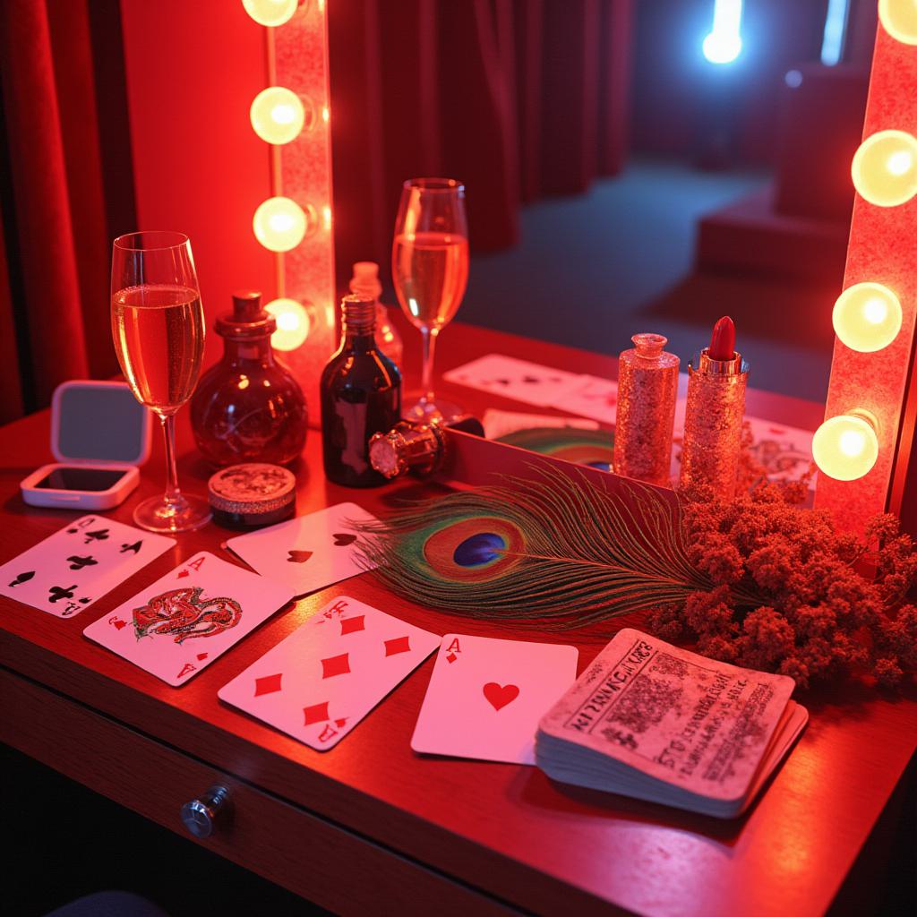 Крупный план стола гримерки с неоновой подсветкой зеркала в лампочках (как в Мулен Руж). На столе — не обычная косметика, а рассыпанные игральные карты (черви и бубны), яркое перо павлина, пудреница в виде старого циркового билета и бокал шампанского. В отражении зеркала вместо лица человека — мелькает силуэт акробата на трапеции., · Цвета: Неоново-розовый, электрик, серебро.