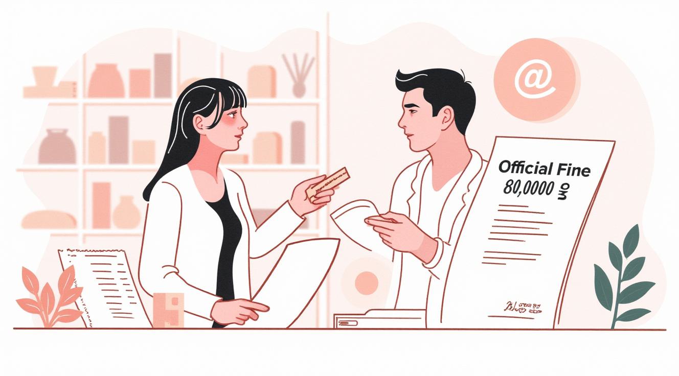 Слева — кассир в магазине, спрашивающий покупателя шепотом. Между ними небольшая касса. Справа — крупный официальный документ и цифрой штраф «30 000 ₽». По середине — контраст: на первом плане лежит бумажный кассовый чек, а за ним, размыто, виден смартфон с символом @ (электронная почта). Общая атмостура — напряженность и юридическая строгость.