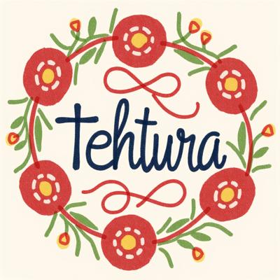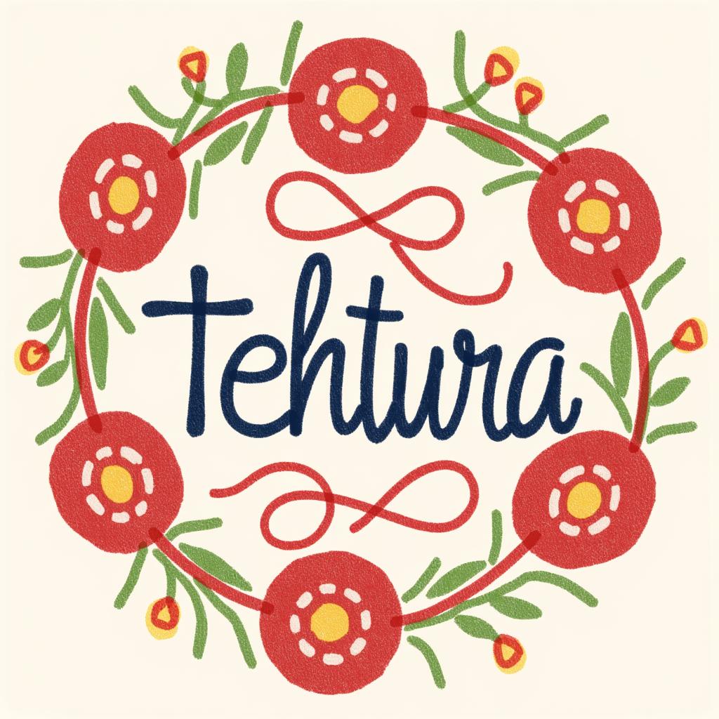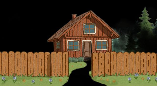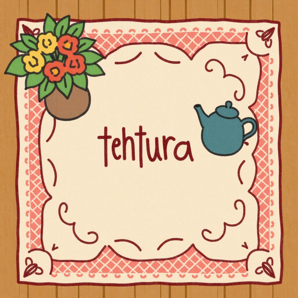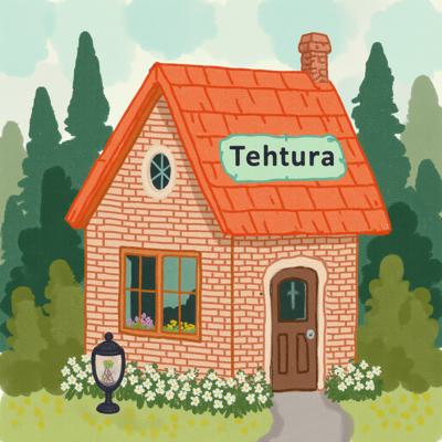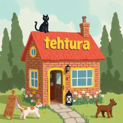 Маленький кирпичный домик с яркой крышей. На нем объемная вывеска написано tehtura. Это творческая художественная мастерская. Рядом со входом красивый черный фонарь, вокруг цветочные растения. Сзади лес , На крыше сидит черный кот, во дворе бегают большие собаки. , Во дворе стоит мольберт, на веревках висит ковер