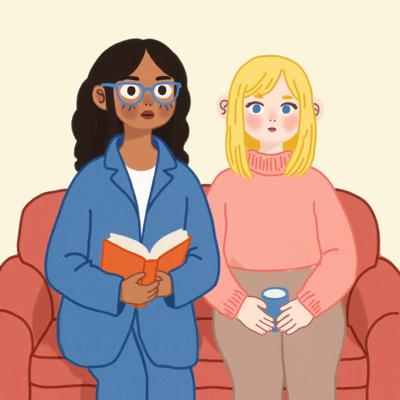 Сверху оставь пространство для будущего текста, на диване сидят две девушки. У одной светлая кожа, темные длинные кудрявые волосы и очки, она одета в голубой брючный костюм и читает книгу. Рядом сидит вторая девушка, у нее пухлые губы, светлые волосы ниже плеч подстрижены каскадом, она одета в красном платье, развалилась на диване и смотрит вверх, губы накрашены красным