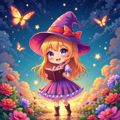 A cute chibi witch, bright colorful dress, holding a magical book and a wand, surrounded by sparkling stars and flowers, magical glowing butterflies, whimsical fantasy art, cheerful colors, hyper detailed, vibrant, cute, 4k. , Negative Prompt: blurred, deformed, bad anatomy, bad hands, low quality, dark, scary, realistic, text, watermark.