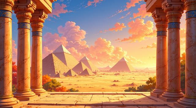 Роскошный фон в мультяшном стиле для слот-игры. В центре композиции — пустое пространство для игрового поля. Слева и справа расположены массивные колонны с древнеегипетскими письменами и орнаментами, украшенные золотыми деталями. На заднем плане видны величественные пирамиды и песчаные дюны, слегка подсвеченные солнечными лучами. Атмосфера должна передавать богатство и величие Древнего Египта, с акцентом на роскошь, золотые оттенки и декоративные детали, но при этом оставлять композицию лёгкой и гармоничной.