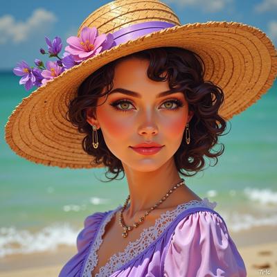 A high-resolution artistic photograph of a serene and majestic scene on a beach at sunset in the style of Annie Leibovitz.. A woman with long, wavy brown hair and light skin wears a flowing, sheer white gown and holds a white rose. Her makeup is bold, with strong eyebrows and dark eye makeup. Beside her stands a majestic white horse, adorned with decorative gold and white tack. The setting features gentle waves, a warm, glowing sunset that casts a golden hue, and a partly cloudy sky. The overall mood is one of elegance and tranquility.