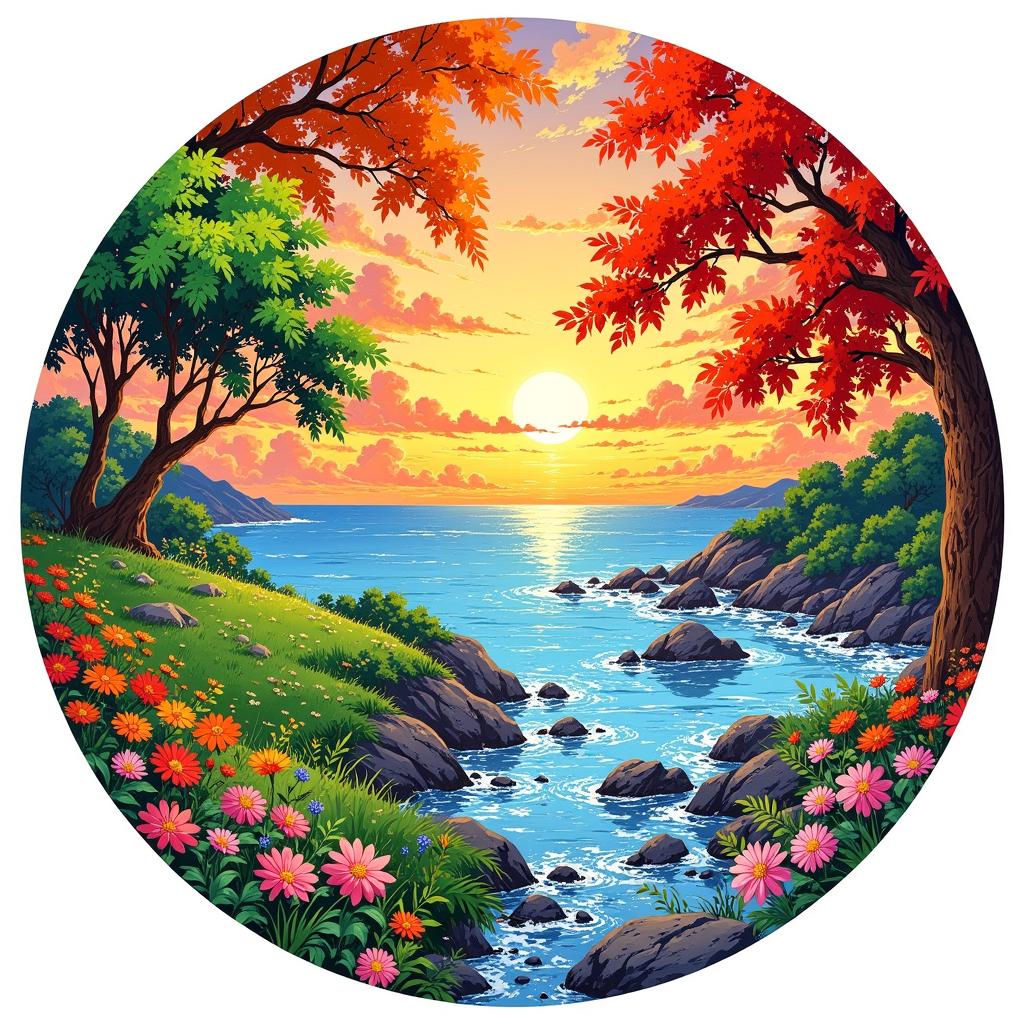 Collage in the shape of a circle, divided into four parts, each part symbolizing a season: spring with flowers and greenery, summer with sun and sea, autumn with leaves and warm tones, winter with snow and ice. Artistic paper collage style, with cutout texture, smooth transitions between the sections..