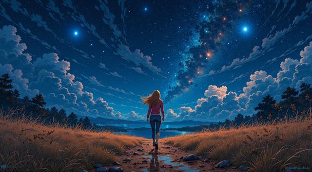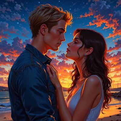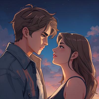 Парень и девушка стоят друг напротив друга, парень касается рукой лица девушки. Парень - возраст примерно 22 года, симпатичный, высокий, волосы светлого оттенка. Девушка - возраст 18 лет, миловидной внешности, русые волосы. На фоне - летняя ночь, городской ландшафт. Изобразить как обложку для романа в жанре любовный молодежный роман. +Уточнение: изменить стиль рисунка с сохранением сюжета и персонажей