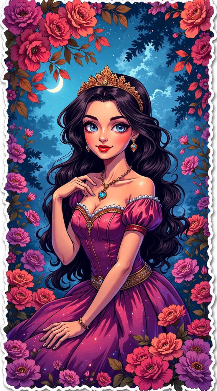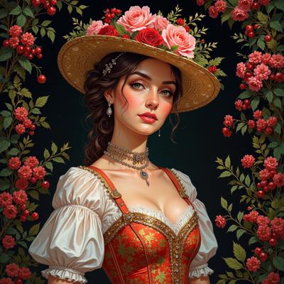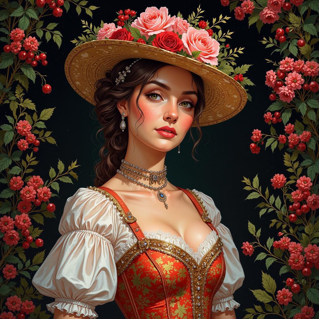 The painting is painted in a modern, vintage and folk style. A beautiful aristocrat, delicate features, a beautiful suit with a corset on her head, a gorgeous hat, among flowers and plants, frosty tones, pattern, cranberries, lingonberries, drops of berry juice, elegant, refined, on a dark background, with increased detail, dust, beauty and fantasy.,
