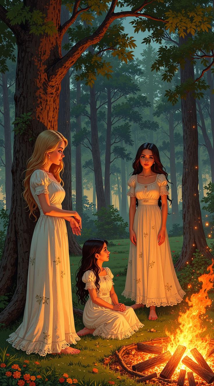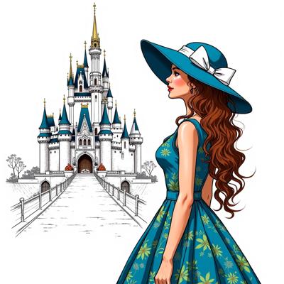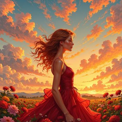 Sky, clouds, woman with red hair, long crimson dress, background of flowers, hyperrealism, golden hour lighting, sunset, warm and soft light, inspired by the works of J,M,W, Turner and John Constable, oil painting style, dreamlike atmosphere, ethereal, 19th-century romanticism, Canon EOS R5, 50mm lens, 8k resolution
