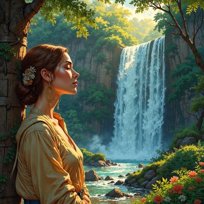 a painting depicting a woman with her eyes closed next to a waterfall, the mythology of the earth goddess, the sacred feminine principle, beautiful fantasy painting, dramatic fantasy art, the goddess Inanna, beautiful fantasy art, very beautiful fantasy art, the goddess of nature, figurative realism, naive art, enchanted by the spirit of nature, dream landscape art, surreal art, inspired by (Tomasz Alen Kopera:1.5),