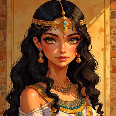 1 girl, ((young girl)) (full-length), ((feminine face)), (golden eyes), beautiful expressive eyes, pretty face, gold eyeliner, slightly smiling, (long hair), black hair with golden strands, elegant, gold bracelets, gold earrings, (Egyptian queen), Egypt, Egyptian queen, Egyptian princess, golden tiara, Egypt in the background, Egyptian queen dress.,