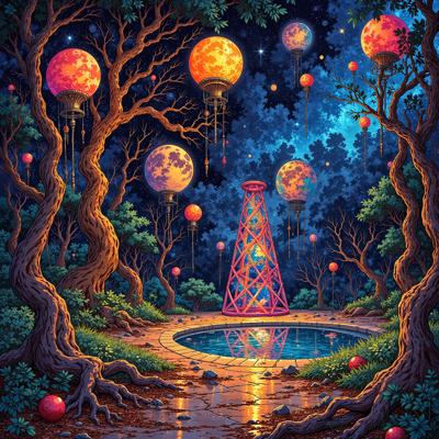 A reflection of a face within a maze of mirrors, surrounded by swirling vines and floating geometric shapes, conveying a sense of confusion and wonder. The scene takes place in a twilight forest where shadows dance. The style should be vibrant and expressive, reminiscent of Salvador Dali, with a surreal touch of levitating animals wearing hats.
