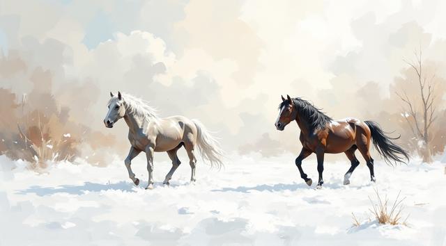 АБСТРАКТНАЯ ЖИВОПИСЬ НА ФОНЕ НЕБРЕЖНЫХ ГЕОМЕТРИЧЕСКИХ ФОРМ И ЛИНИЙ НАРИСОВАННЫХ ГРУБО В ЦЕНТРЕ ФРАГМЕНТЫ ДВУХ ЛОШАДЕЙ ДВУХ АБСТРАКТНЫХ РАЗМАЗАННЫХ МЕСТАМИ НЕОПРЕДЕЛЕННОСТЕЙ снег может не только укрыть землю, но и скрыть её нечистоты, хаос и беспорядок, сделать её чистой и прекрасной, как невесту. Но все же скрыть что-то – не значит очистить. Скрытые под снегом темнота и нечистота выйдут на поверхность. Визуально хаос, прорывающийся из-под белой поверхности, лишь усиливает впечатление от свежести и снежной чистоты. Земное начало выступает только как контраст, противоположность идеальной чистоте.
