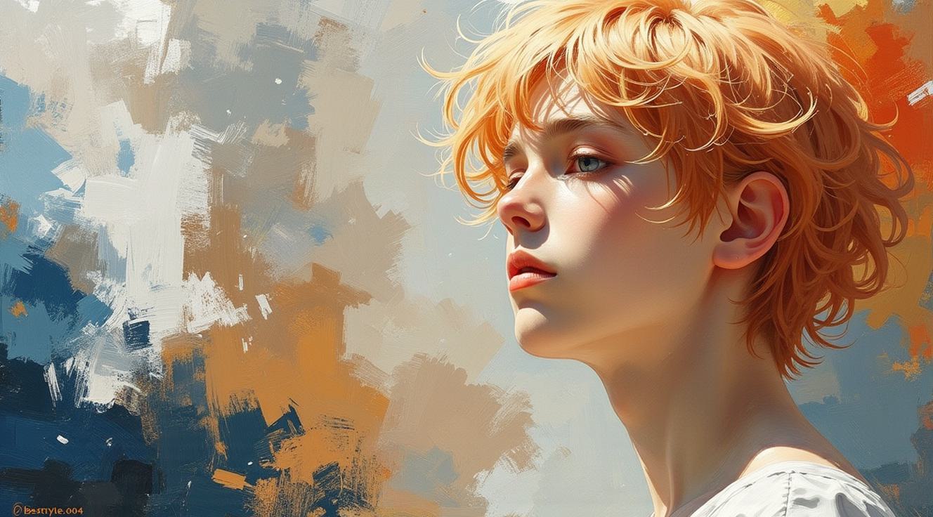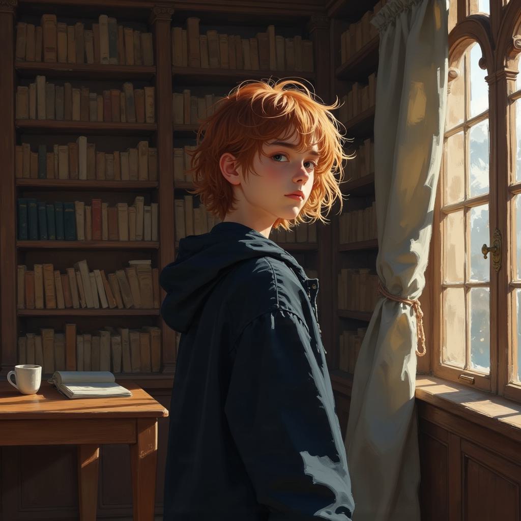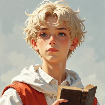 Католический священник, молодой мужчина, блондин, с вьющимися волосами средней длины (до плеч). Черты лица: голубые глаза, длинные белые ресницы, светлая кожа без изъянов, чистый выбритый подбородок и щеки, слегка розовые губы, легкая, искренняя улыбка. Взгляд направлен в книгу (Библию) в его руках. Обстановка: интерьер церкви, главный фокус — большое готическое витражное окно за его спиной, заполняющее кадр цветным светом. Стиль: реалистичная цифровая живопись, ренессансное освещение, контровой свет от витража, атмосферно, детализированные текстуры кожи и ткани.
