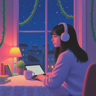 Уютная аниме-сцена в стиле lo-fi. Молодая девушка в больших наушниках сидит у окна или за столом, погружённая в мысли или работу. В комнате мягкий тёплый свет, гирлянды, свечи, книги, ноутбук, чашка с напитком. За окном ночь, дождь или снег, городские огни, спокойная атмосфера одиночества и уюта. Цветовая палитра приглушённая, тёпло-холодный баланс, мягкие тени, кинематографичный свет. Настроение — спокойствие, лёгкая меланхолия, концентрация, музыка как личное убежище. Детализированный аниме-арт, чистые линии, мягкий рендер, high quality, cozy, aesthetic, lo-fi mood.