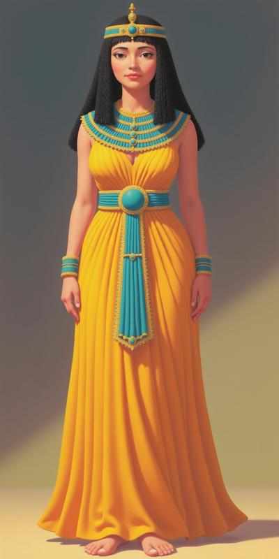 A full-body 2D cartoon Cleopatra character in ancient Egyptian royal attire, designed as a slot game high-pay symbol. Cleopatra is standing upright, facing forward, with a graceful and majestic pose. She wears a golden dress with turquoise and blue accents, decorated with jewelry, wide beaded collar, golden bracelets, and a traditional cobra crown (uraeus). Her facial expression is gentle and kind, with a soft smile. The character is framed by a decorative golden border with turquoise accents, making her stand out as a high-value symbol. Art style: soft, colorful, hand-drawn 2D, smooth shading, shiny highlights, no 3D realism. Transparent background.