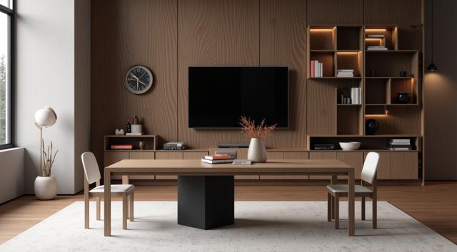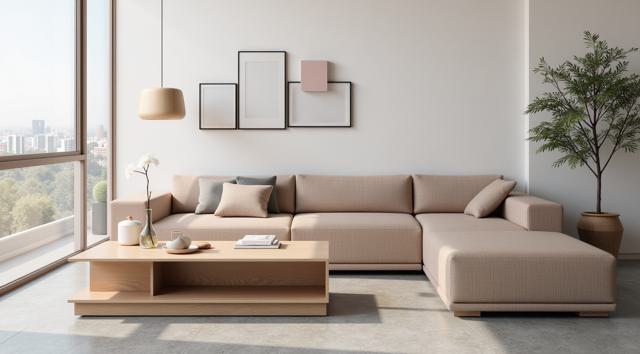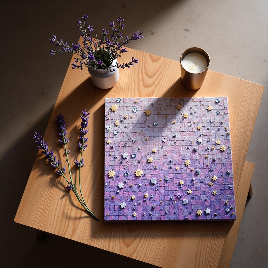 Стол, на котором лежит квадратная картина с алмазной мозаикой. Рядом стоит вазочка с несколькими веточками лаванды, 1 одна декоративная свечка. Несколько веток лаванды лежит на столе. Вид сверху. Акцент сделан на картине, она занимает основное место на столе. Атмосфера волшебства и радости. Стильный современный светлый интерьер квартиры и большой деревянный стол