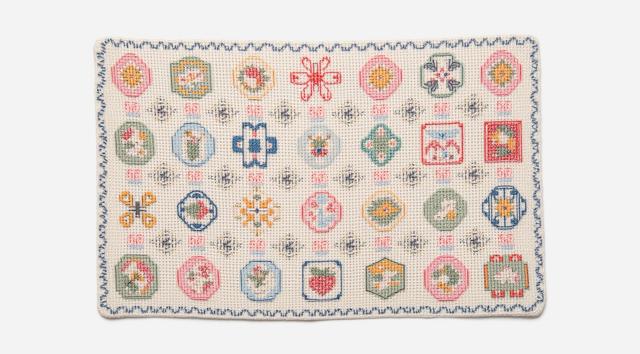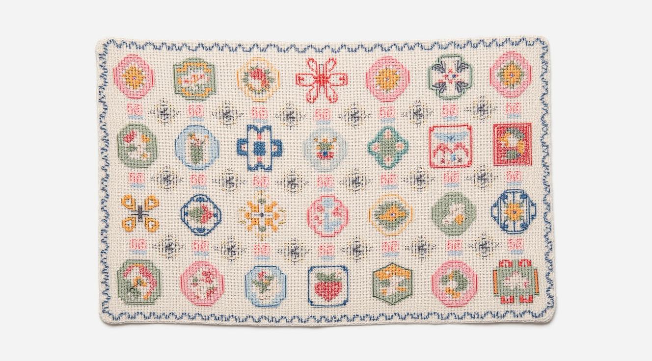 тканевая прямоугольная сервировочная салфетка, оформленная в гжельском стиле, но с уникальной “начинкой” узора — то есть вместо обычных линий и лепестков узор складывается из слов, написанных так, чтобы издалека они образовывали привычный орнамент (цветы, завитки, птицы и т.д.), а при приближении можно прочитать эти слова. Цвета - белый, синий
