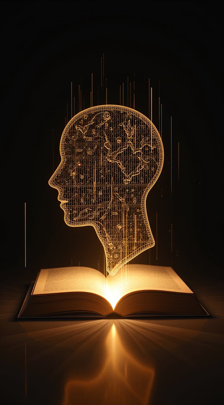 "кода доступа к подсознанию" через метафору архитектуры мозга. Передний план: открытая книга, из страниц которой исходит мягкий золотистый свет. Свет трансформируется в тонкие линии и символы, напоминающие двоичный код или древние руны, которые втекают в силуэт человеческой головы. Внутри силуэта — трехэтажное здание: темный фундамент (рептильный мозг), теплый светящийся первый этаж (лимбика) и легкая полупрозрачная мансарда (неокортекс). Код проникает именно в нижние этажи, минуя верхний. Цветовая гамма: глубокий синий, золото, фиолетовый. Стиль: метафорический сюрреализм, чистый, без лишних деталей. Передать идею: слово становится ключом к древним механизмам. в стиле киберпанк,