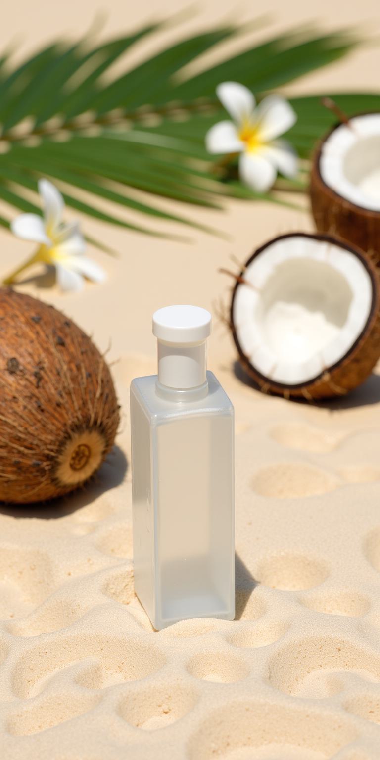 Product shot of a small, transparent rectangular plastic bottle standing upright on beige sand, rear view, 3/4 angle. In the background, an artistic composition of halved ripe coconuts with juicy white flesh, fresh palm fronds, and delicate white plumeria flowers arranged elegantly on the sand. Gentle ocean waves approaching from the bottom right corner, creating soft foam on the wet sand. Soft, warm golden hour lighting, shallow depth of field (background softly blurred), bokeh, high detail, 8k resolution, photorealism, commercial photography, macro detail on the bottle and coconut textures. --ar 3:4