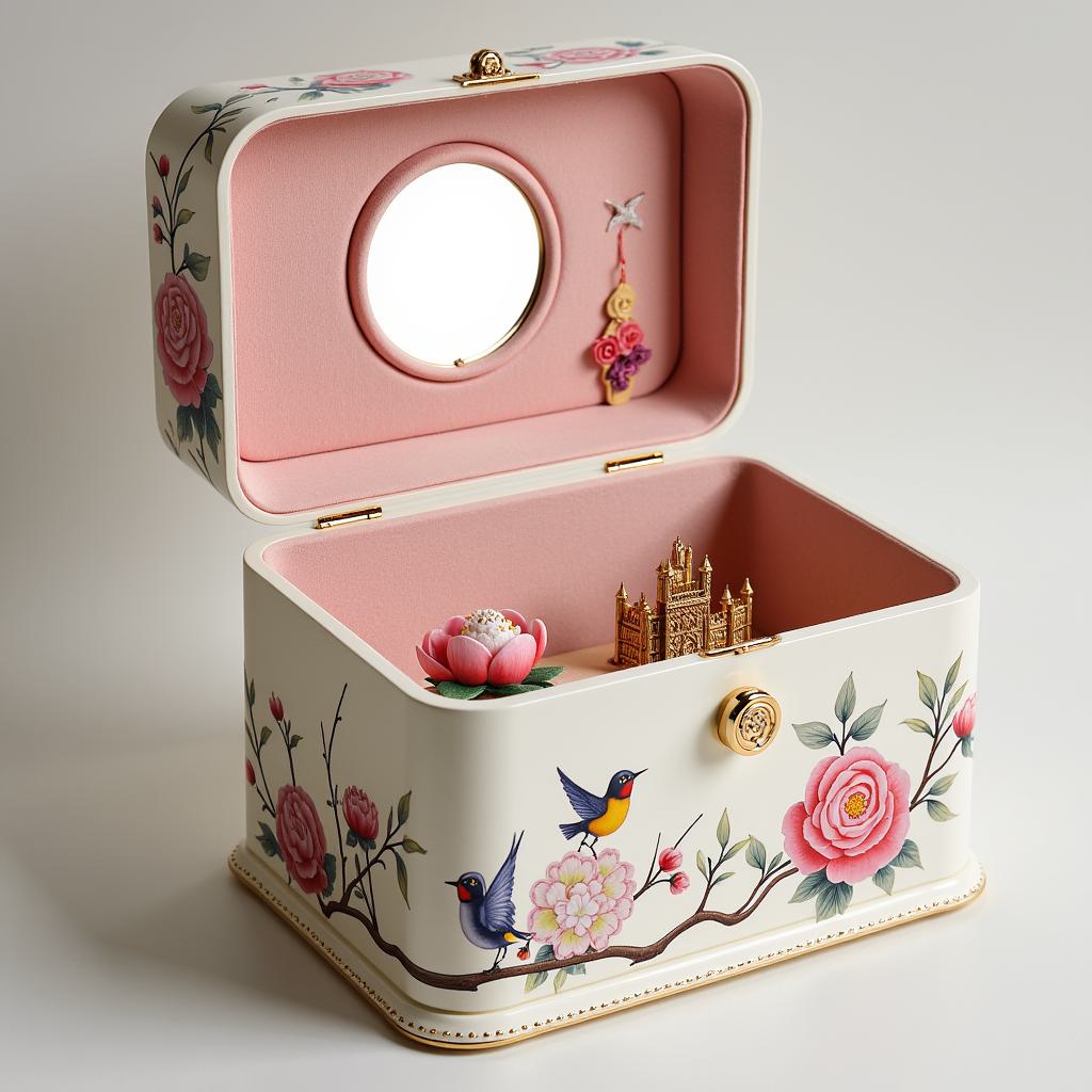 Шкатулка в викторианском стиле, окрашенная в слоновую кость, украшена ручной росписью: реалистичные цветы (розы, пионы, гортензии) и яркие птицы (колибри, ласточки) среди ветвей. Внутренняя отделка – пудрово-розовый бархат, есть зеркальце и миниатюрный золотой замок-роза. Это не просто хранилище, а произведение искусства.