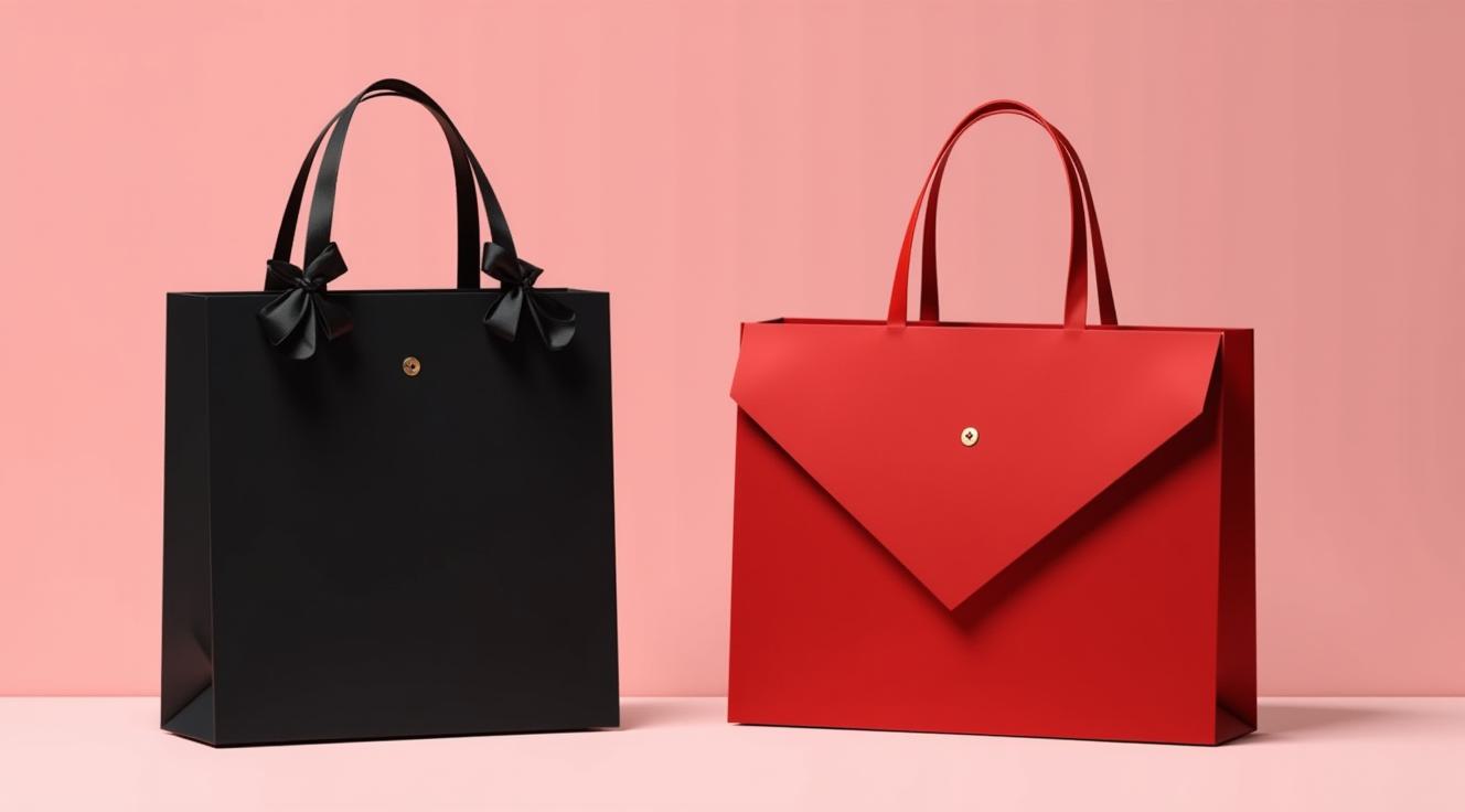 Two luxury paper bags in different colors, one black vertical and the other red horizontal. The bags emphasize the quality and elegance of their lines and materials. They are made of thick matte paper, with a black bag featuring satin ribbon handles, a minimalist logo, and a transparent lacquer on a matte surface, and a red bag with braided cord handles, a raised logo, and a minimalist design. One bag is taller than the other. The background is light. The style is a professional studio shot of a branded product.