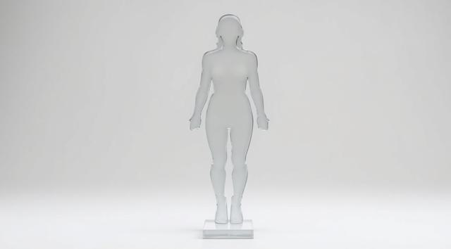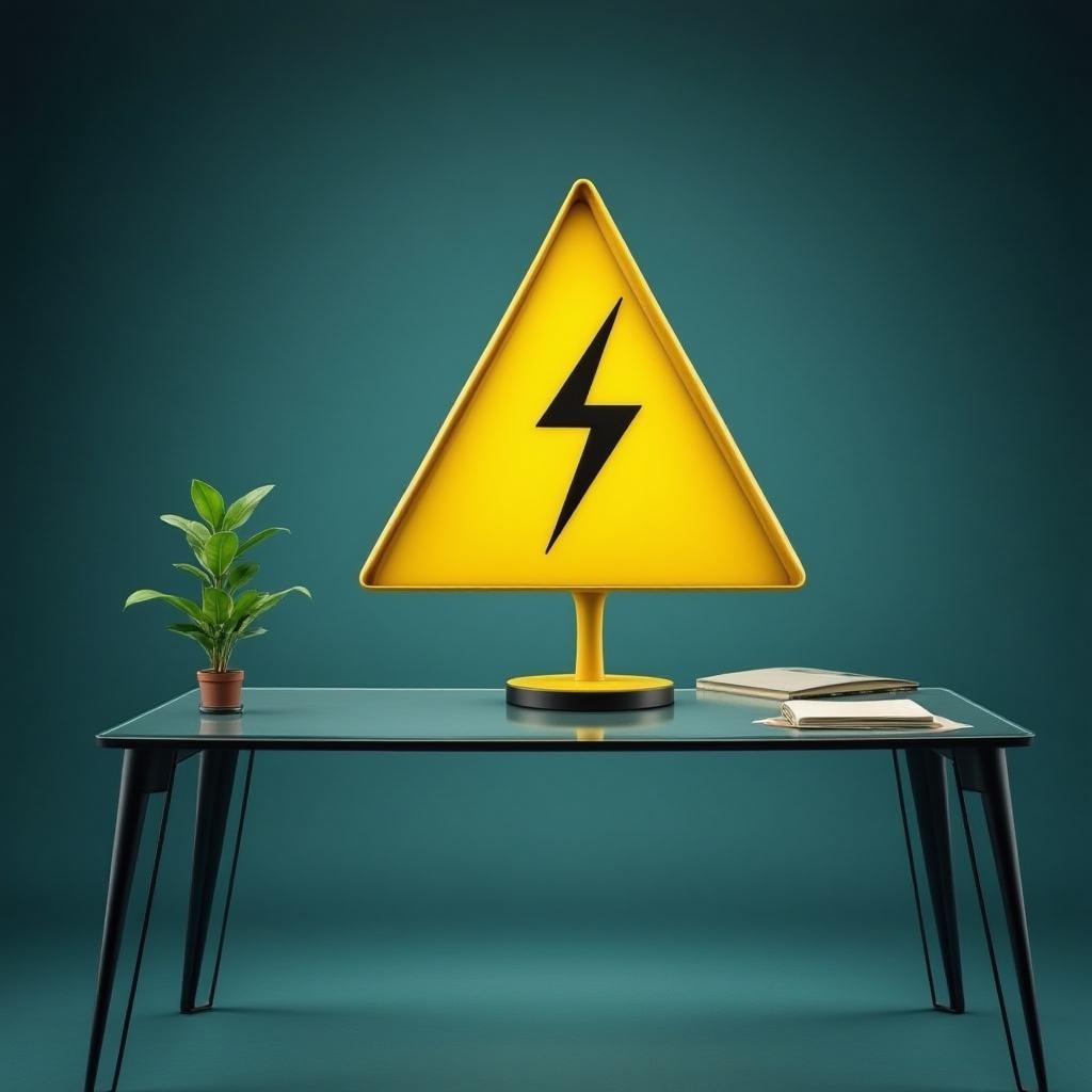 Наградная фигурка в форме желтого треугольника с символом электрического разряда, на стеклянном офисном столе, в окружении офисной техники. Темно синий и зеленый