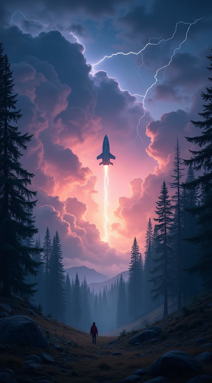 Мокап не нига реклама блокбастер фентези обложка лес и космический корабль фон впечатляющий гроза небо,