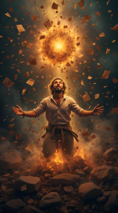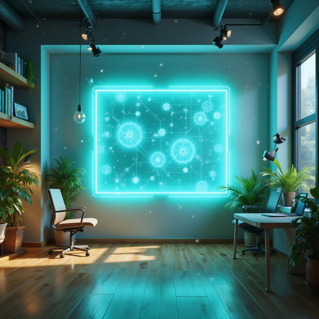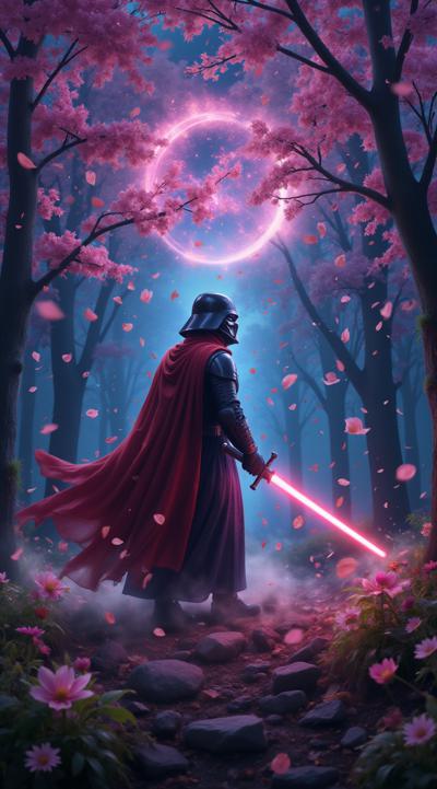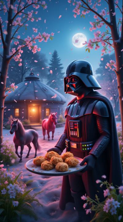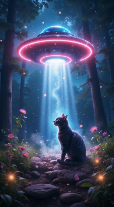 Представь сюрреалистическую сцену встречи земного и инопланетного миров: над зачарованным ночным лесом зависает огромный неоновый НЛО, словно корабль из другой галактики. Его свет проникает сквозь тьму, создавая магический луч, в котором застыл силуэт любопытного кота. Кот будто общается с инопланетным гостем, подняв лапу в жесте удивления. Вокруг — светящиеся грибы, словно стражи этого волшебного места, и маленькие летающие тарелки, кружащие в небесном танце. Атмосфера наполнена ощущением тайны и чуда, а неоновые цвета придают сцене сказочность и футуризм
