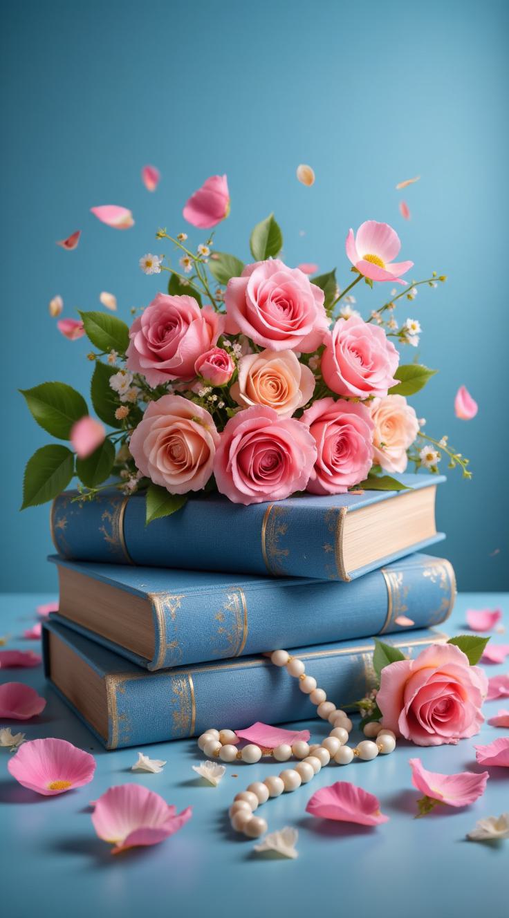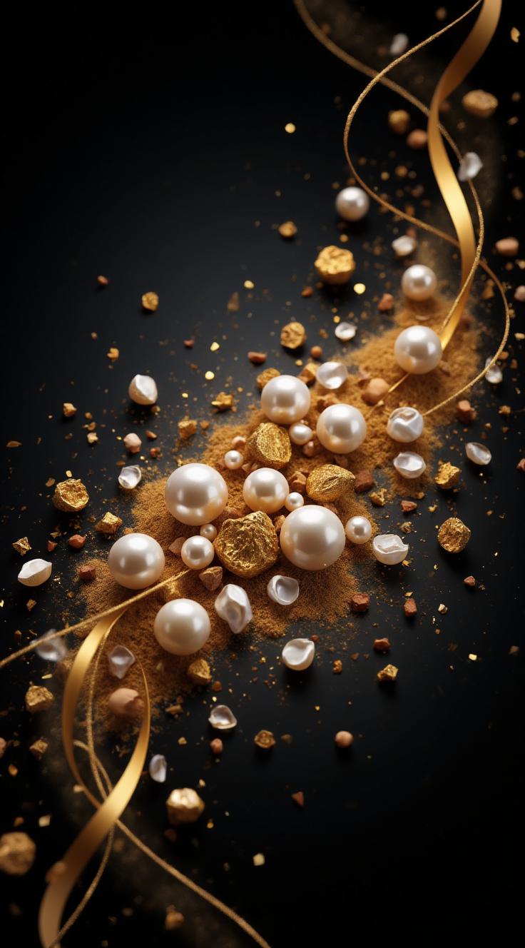 Создай детализированную абстрактную композицию: чёрный фон, поверх которого разбросаны жемчужины и блестящие бусины разных размеров и оттенков (от перламутровых до золотистых). Добавь тонкие золотые нити, пересекающие изображение под разными углами. Эффект блеска должен быть реалистичным, с яркими бликами и мягкими тенями