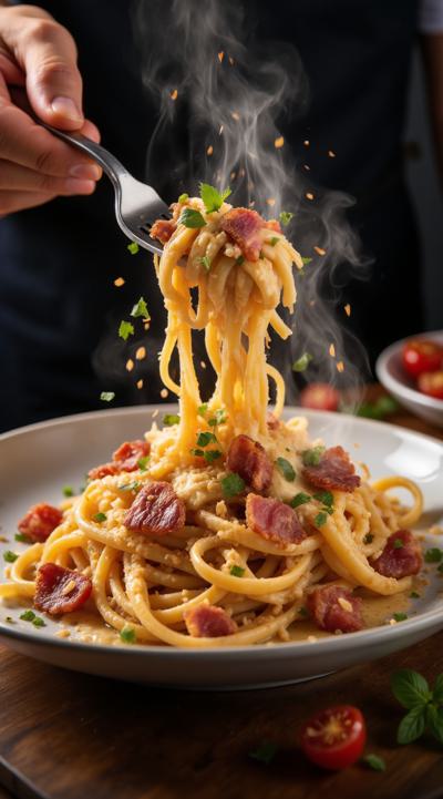 Паста карбонара из бекона со сливками из широкой лапши фетучини. Аппетитно, с расплавленными сыром, микрозеленью, помидорками черри. Ресторанная фудсъемка, вид сбоку, в кадре над тарелкой рука держащая вилку. На вилке лапша, сыр, бекон, которые опускаются в тарелку. Над тарелкой пар. Профессиональная съемка в светлом ключе, все изображение в фокусе с высокой резкостью