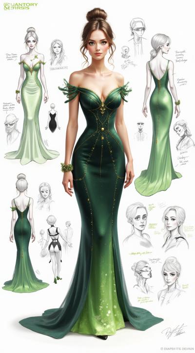 Лист концептов для [Платье], с проработанными фронтальным, боковым и задним видами, включающими детализированные эскизы лица и аксессуаров. Добавлены аннотации с заметками дизайна и подписи компонентов. Выполнено в стиле чертежа с сияющими линиями в [Зеленое] и основной структурой в [черный], представлено на чистом белом фоне.