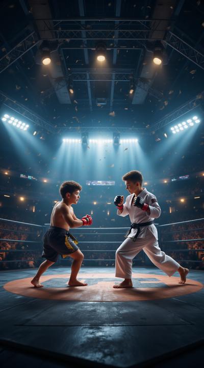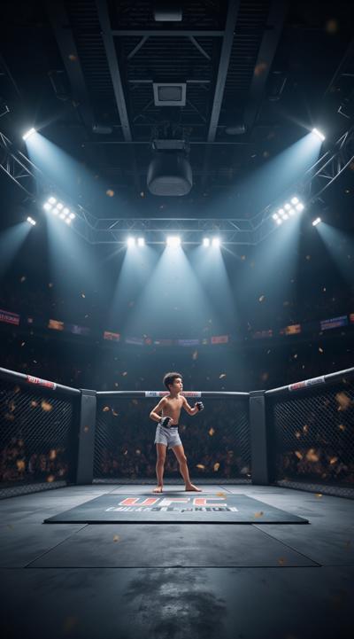 Фон для фотосессии детей, занимающихся боевыми искусствами. Стиль постеров UFC 2025: тёмная арена, но светлая по общей яркости. Без людей, только фон. Почти всё изображение занимает ринг с яркими огнями прожекторов, сиянием и металлическими конструкциями. Пол — небольшой участок матов на переднем плане, в фокусе. Задний план — сильно размытый, много густого дыма, подсвеченного светом. Атмосфера — мощная, торжественная, энергичная.