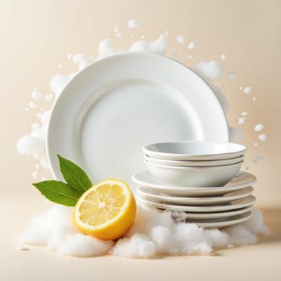 На изображении представлена композиция, которая сочетает в себе элементы, ассоциирующиеся с освежающими напитками и летним отдыхом. В правой части кадра находится стопка белых тарелок , в нижнем левом углу кадра лежит долька лимона с зеленым листиком. Вокруг тарелок расположена мыльная пена, создающие ощущение чистоты. Фон изображения выполнен в мягких голубых и белых тонах, что усиливает ощущение свежести и легкости.