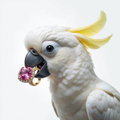 A hyper-realistic studio photo of a white cockatoo parrot in close-up profile view, holding a luxurious diamond ring with a large pink gemstone in its strong black beak. Clean white background, soft diffused lighting, sharp macro focus on feather texture and jewel-ry, glossy highlight on the gemstone, luxury fine jewelry editorial aesthetic, high-end commercial photography style, style photographic