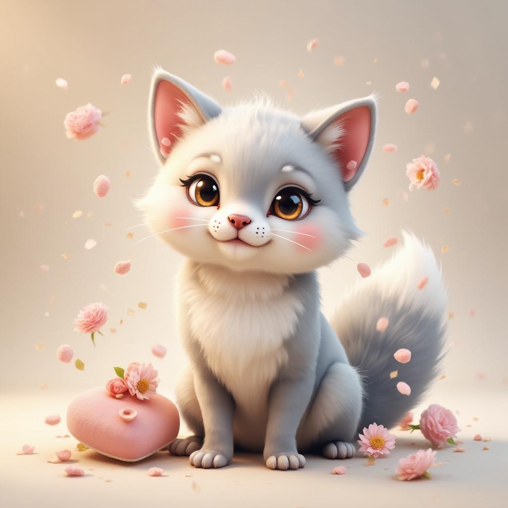 Маскот Вид животного: гибрид кота и песца (чтобы сохранить мягкость и пушистость, но добавить уникальность)., Окрас: градиент от кремового к мягкому серому, с розовыми ушками и носиком, чтобы сочеталось с котиками на чехлах., Характер: озорной, но элегантный — слегка подмигивает одним глазом, как парень слева, и делает «утиные губки», как оба на фото., Аксессуары: маленький бантик с блестящей брошью (отсылка к белой рубашке с брошью) и мини-галстук-бабочка (отсылка к смокингу)., Позы: лапки подняты, как будто он «играет» или позирует для селфи., Элемент фона: маленькое зеркало, в котором видно, что он тоже фотографирует себя на телефон с чехлом с котиком.,