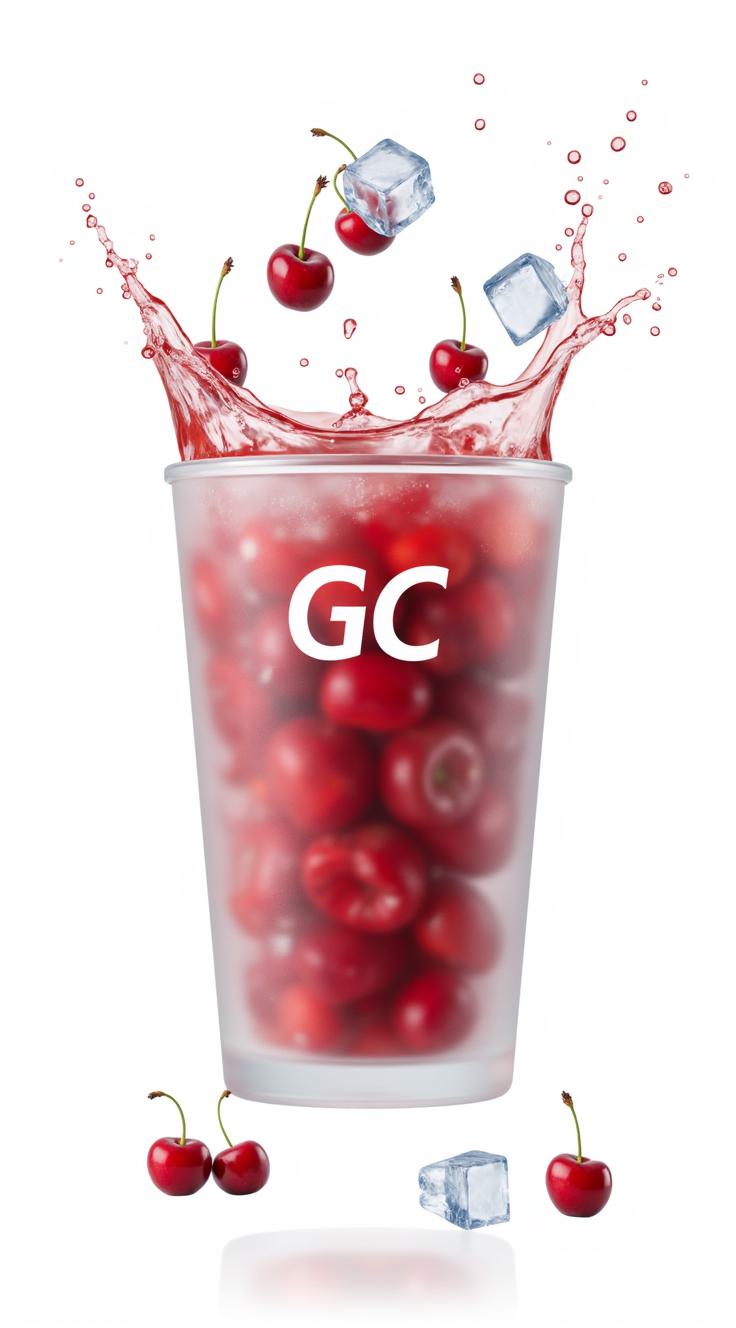 A cup filled, suspended mid-air with a dramatic water splash around it. The cup is covered with water droplets. Surrounding the cup, several fresh cherries and a few ice cubes are flying and splashing in the air, creating a sense of refreshing motion. The lighting is bright, the colors are vivid, and the background is clean and light, making the cup, cherries, and ice pop. The scene feels energetic, summery, and thirst-quenching. No text, no logo — just the dynamic drink, cherries, and a few ice cubes in motion.
