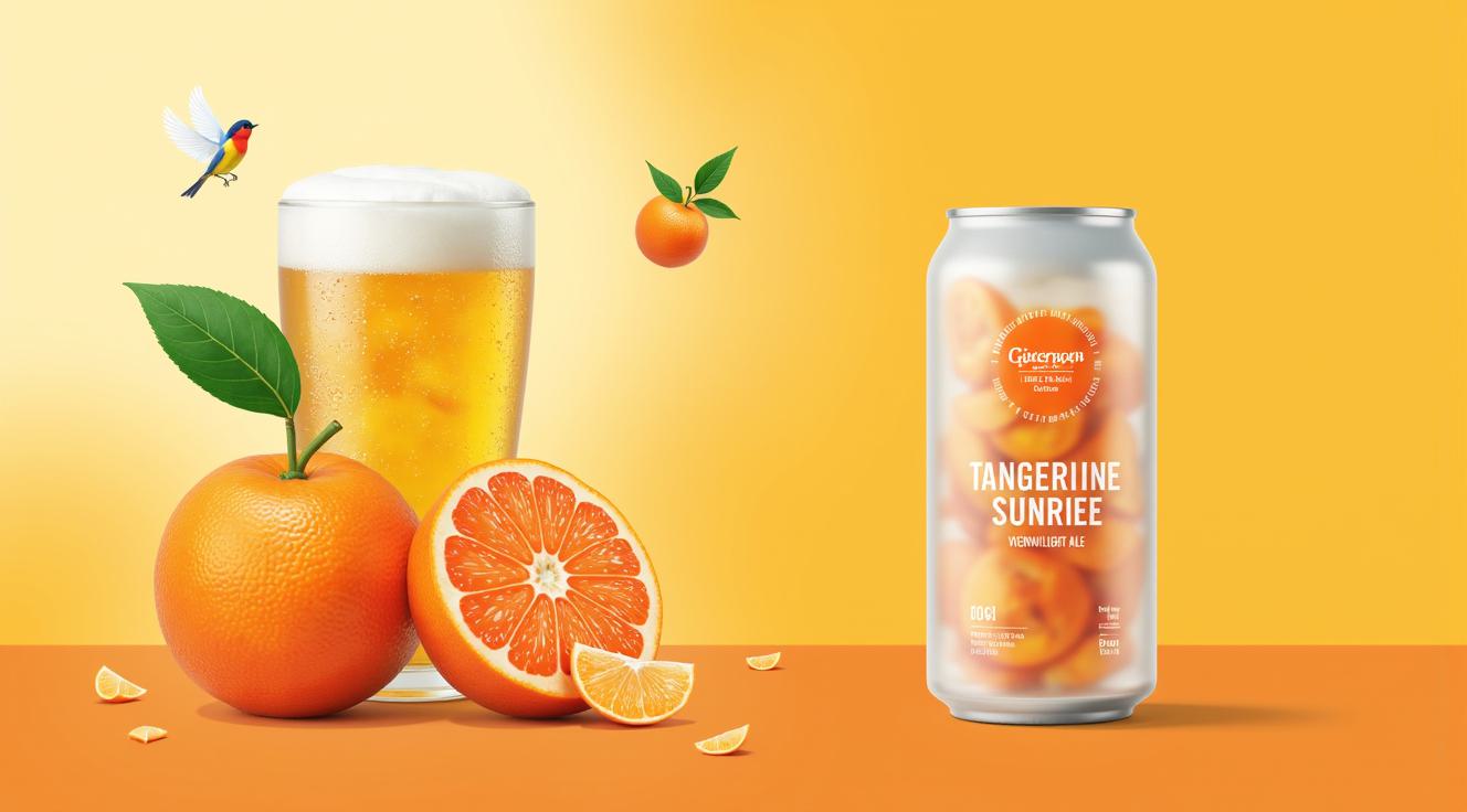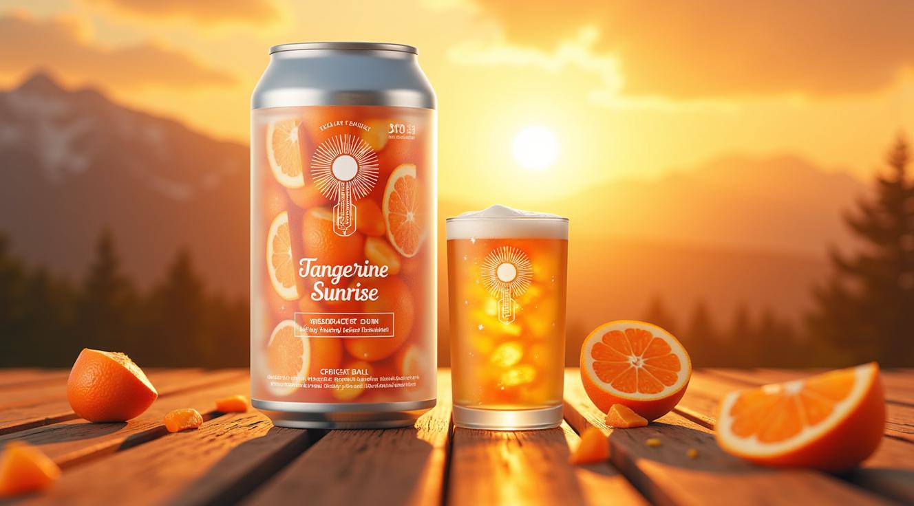 Создай стильную этикетку для пива, жестяная банка, на ней надпись МАНДАРИНОВЫЙ ВОСХОД (Vienna Light Ale). На этикетке: Яркий мультяшный стиль. На переднем плане — половинка мандарина, из которой выплескивается золотистое пиво с белой пеной. Из-за мандарина выглядывает солнце в виде кружки. Вокруг летают веселые хмелевые шишки с улыбками. На заднем плане — венский собор, но его шпиль увенчан пивным бокалом. Цвета оранжевый, золотистый, глубокий синий (рассветное небо). Подпись «Мандариновый восход» стильным шрифтом.