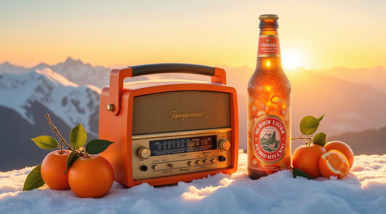 Создай стильную этикетку для пива МАНДАРИНОВЫЙ ВОСХОД (Vienna Light Ale) Австрийские Альпы на рассвете. На вершине горы стоит советский радиоприёмник «ВЭФ», из динамика вместо музыки вырывается струя пива, обвитая мандариновой коркой. Вокруг приёмника пляшут мандарины в кожаных куртках и солнцезащитных очках. Один из мандаринов держит гитару, второй — бокал с пеной.