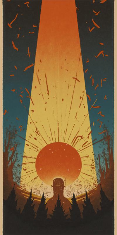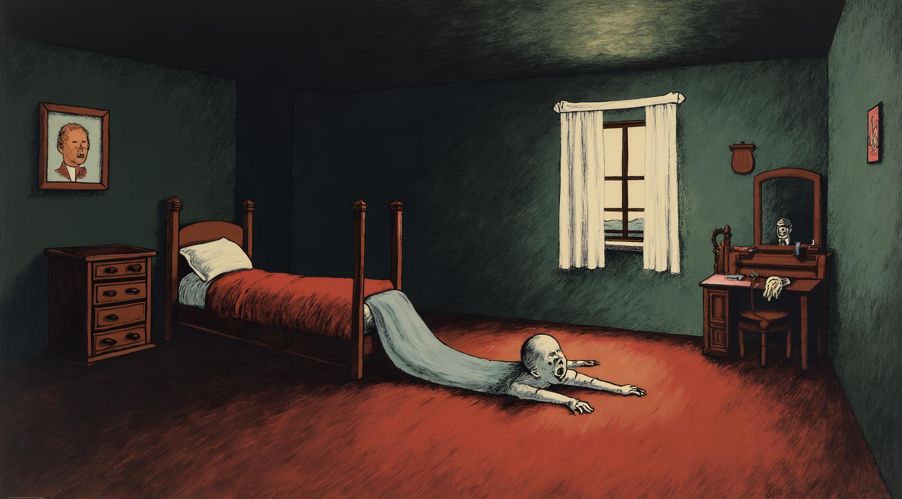 Изображение в стиле Тима Бёртона. Изображение повернуто набок. С левой стороны тёмная детская комната. По середине комнаты стоит детская кровать. Из под кровати тянется страшного вида рука. По середине изображение продолжает плавно перетекать в правую сторону. В правой стороне изображения потолок этой комнаты