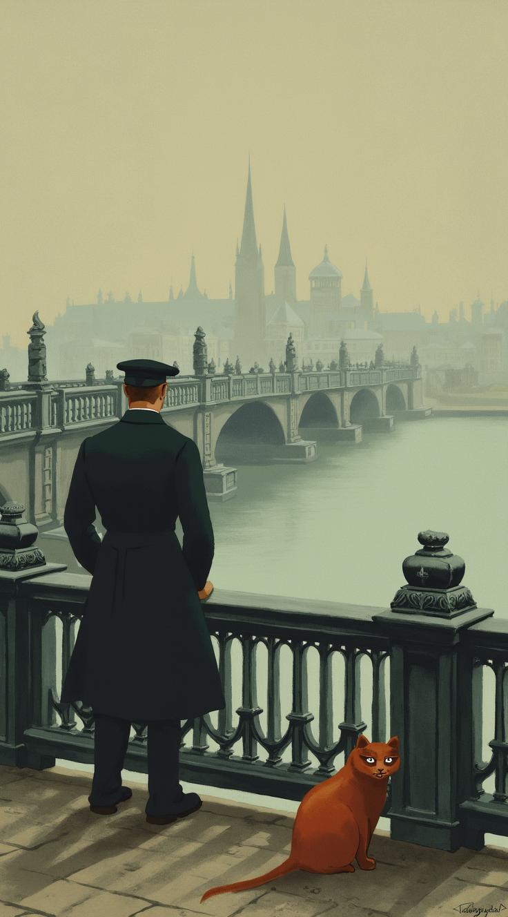 Старинный мост через Неву в утреннем тумане, чугунные перила, гранитные быки. На мосту стоит мужчина в старомодном сюртуке (1860-е), со спины, смотрит вдаль. Рядом сидит рыжая кошка, смотрит на зрителя. С другой стороны моста — едва различимые силуэты современного города (высотки, неон) сквозь дымку. На переднем плане — старинная медная монета (рубль 1869), лежит на чугунных перилах, на ней акцент света. Небо на рассвете: розово-золотое, переходящее в серое. Стиль: фотореализм, масляная живопись, мягкий свет, лёгкая дымка, кинематографичная глубина, символическая атмосфера соединения двух времен.