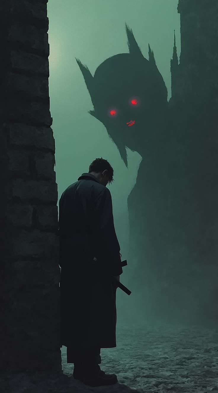 Книжная обложка в жанре городское фэнтези, хоррор. Мужчина-охотник в темной одежде стоит спиной на фоне туманного готического города ночью (Прага). Перед ним на стене лежит его собственная искаженная, аномально длинная и живая тень, которая смотрит на него двумя горящими красными глазами. Стиль: фотореализм, мрачное настроение, глубокие тени, туман, детализация.