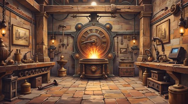 Unfolded book cover art, back cover and spine and front cover. Concept art style. A vintage museum interior mixed with a forge. Steampunk machinery, clockwork mechanisms, glowing hot metal, tongs, antique tools. Color palette: Sepia, rusted iron, copper, deep brown. Art style: Digital painting, intricate details, matte painting, dramatic lighting. --no text, alphabet, characters, letters --ar 16:9 --v 6.0