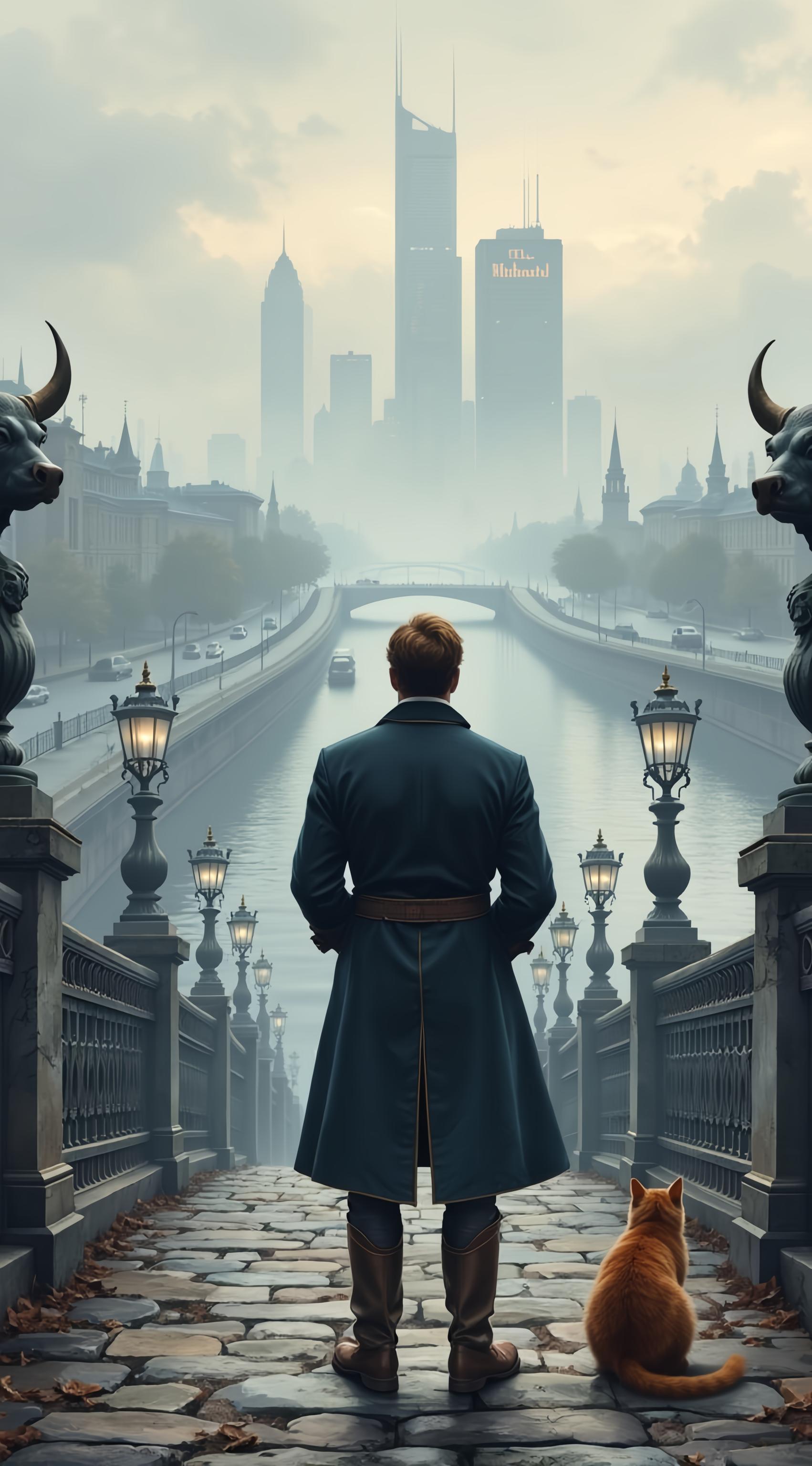 Старинный мост через Неву в утреннем тумане, чугунные перила, гранитные быки. На мосту стоит мужчина в старомодном сюртуке (1860-е), со спины, смотрит вдаль. Рядом сидит рыжая кошка, смотрит на зрителя. С другой стороны моста — едва различимые силуэты современного города (высотки, неон) сквозь дымку. На переднем плане — старинная медная монета (рубль 1869), лежит на чугунных перилах, на ней акцент света. Небо на рассвете: розово-золотое, переходящее в серое. Стиль: фотореализм, масляная живопись, мягкий свет, лёгкая дымка, кинематографичная глубина, символическая атмосфера соединения двух времен.