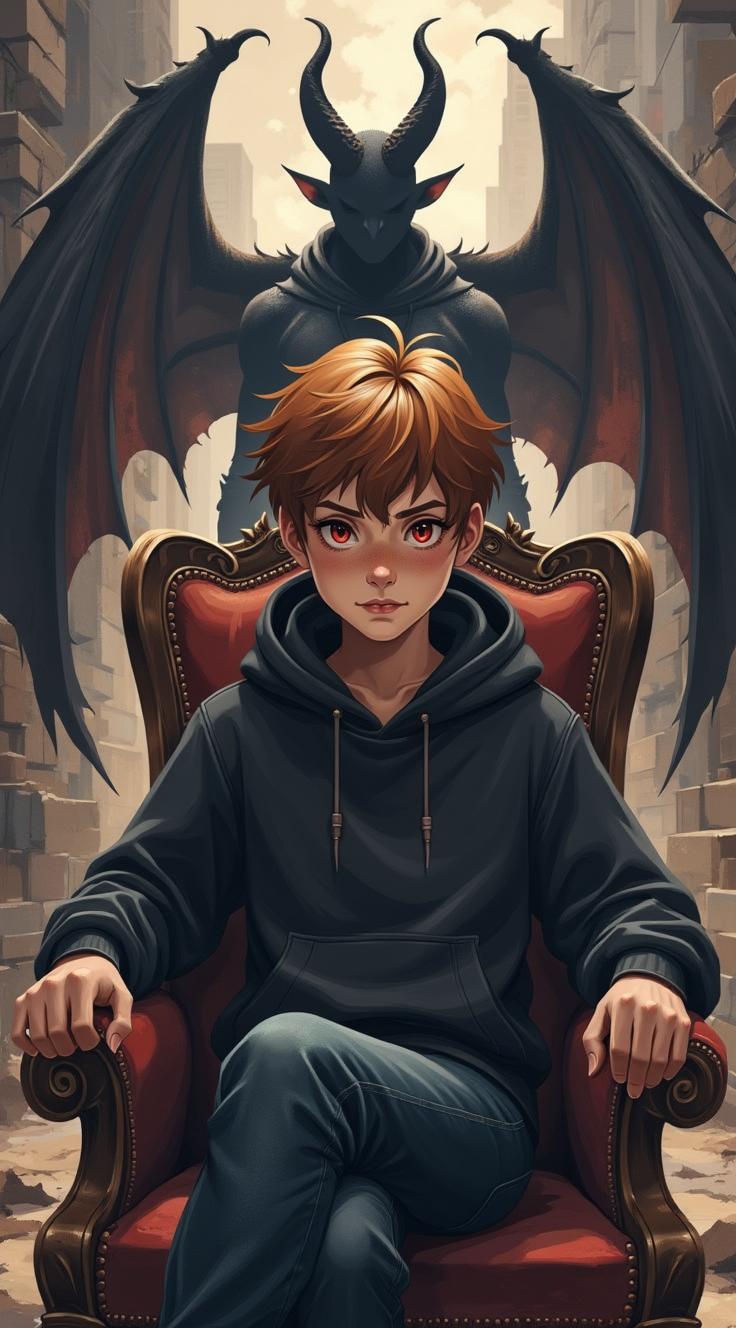 "A 14-year-old teenager with chestnut hair, red eyes with slit pupils, and fair skin, sitting in a chair with one leg crossed over the other, hands resting on the armrests, wearing a black hoodie. Behind the teenager stands a dark demonic silhouette with horns and large wings, back facing the viewer. In the background, a vast night megapolis glows with neon lights, and at its center, gigantic fiery gates of Hell are opening. Cinematic lighting, dark fantasy atmosphere, dramatic and detailed composition, highly detailed, epic scene."